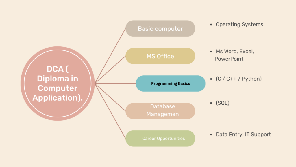 Diploma in Computer Applications (DCA) is a short-term professional course designed to provide students with essential computer skills and knowledge of software applications. The course covers basic computer concepts, operating systems, and office tools like Word, Excel, and PowerPoint. Students also learn internet usage, email communication, and fundamental programming languages such as C or Python, along with introductory database management skills. DCA equips individuals with practical abilities that are useful for office work, IT-related jobs, and further studies in computer science or information technology. Typically lasting from six months to one year, this course is ideal for beginners who want to build a strong foundation in computer applications and enhance their career prospects.